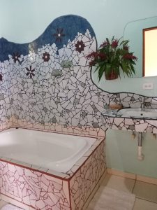 • Amenities: A private bathroom with a bathtub, a fan & a couch.